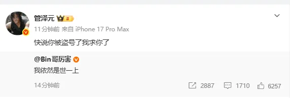 管泽元转发Bin社媒:快说你被盗号了我求你了